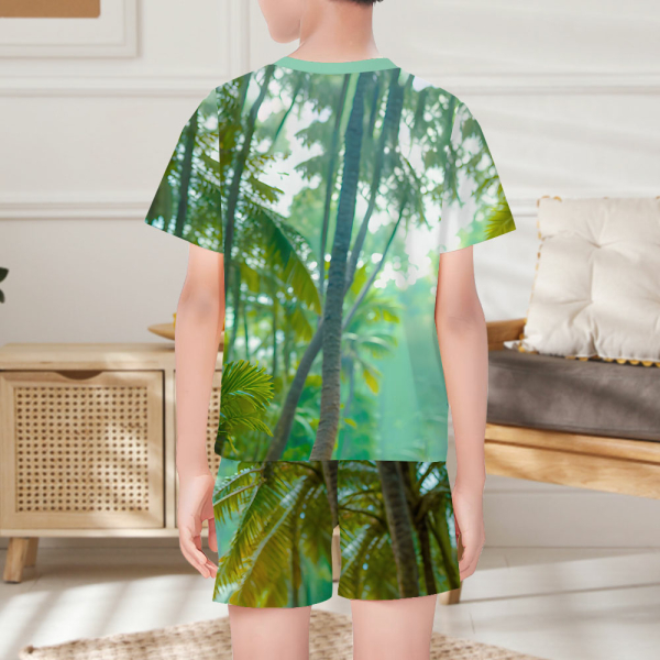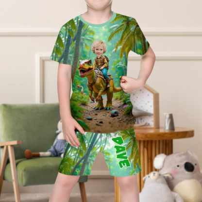 Custom Riding Dinosaur Boy Hero Photo Pajamas Crew Neck Short Sleeve Short Pants Face & Name House-wear Suit For Boys