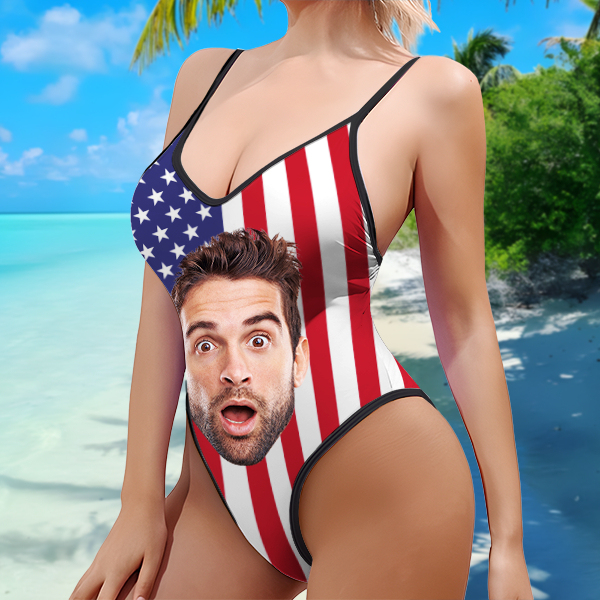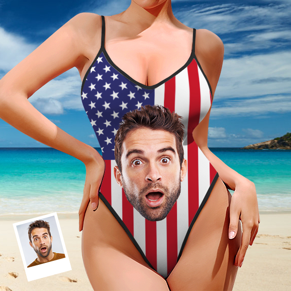 Custom V-neck One-piece Bathing Swimsuit Personalized Face American Flag V-back Swimsuit For Women,gift For Wife