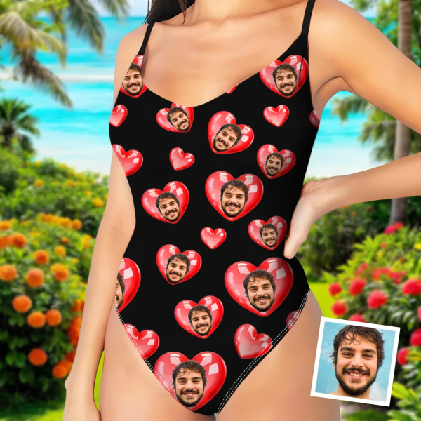 Custom V-neck One-piece Bathing Swimsuit Personalized Red Heart Face Straps Slip Swimsuit For Women,gift For Wife