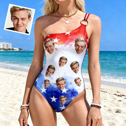 Personalized Face Custom Swimsuit Women's One-shoulder Swimwear American Flag Bathing Swimsuit