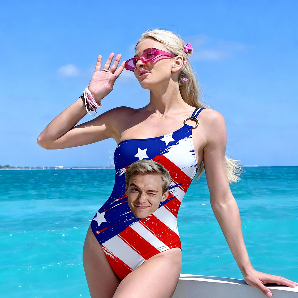 Personalized Face Swimsuit Custom Women's One-shoulder Swimwear American Flag Bathing Swimsuit